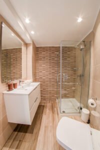 The bathroom features a spacious walk-in shower with a glass enclosure and high-end fixtures.