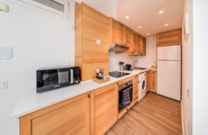 The overall aesthetic is clean and contemporary, ideal for guests looking for a comfortable and functional cooking space.